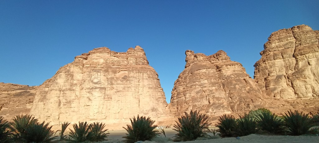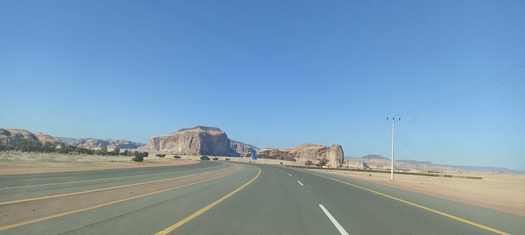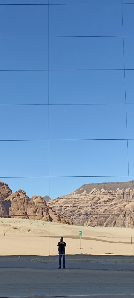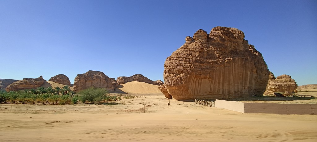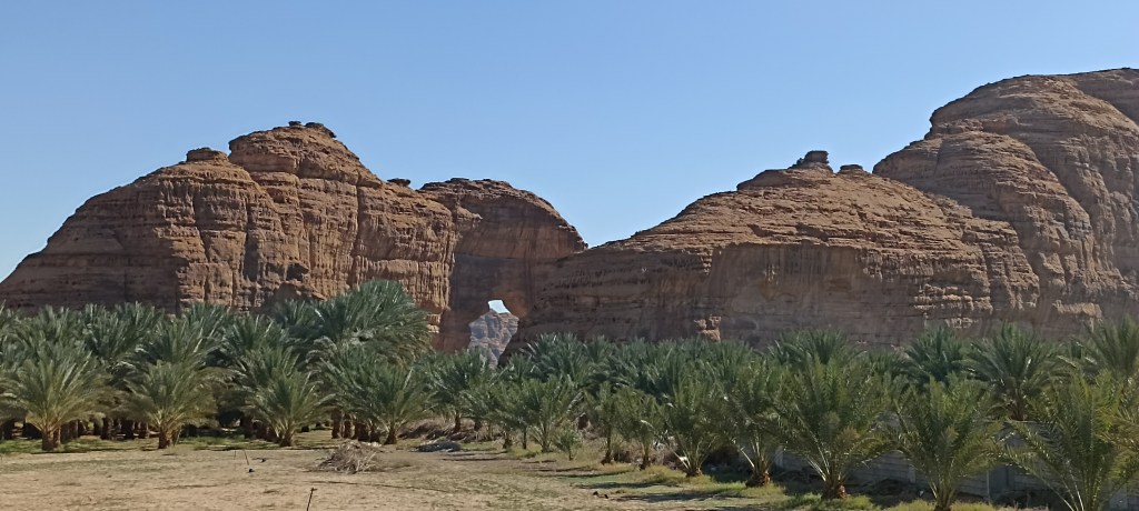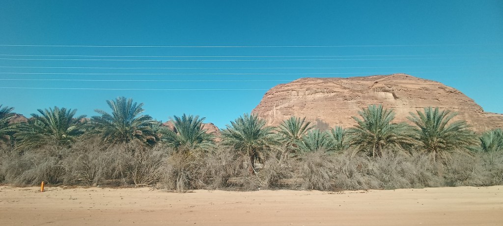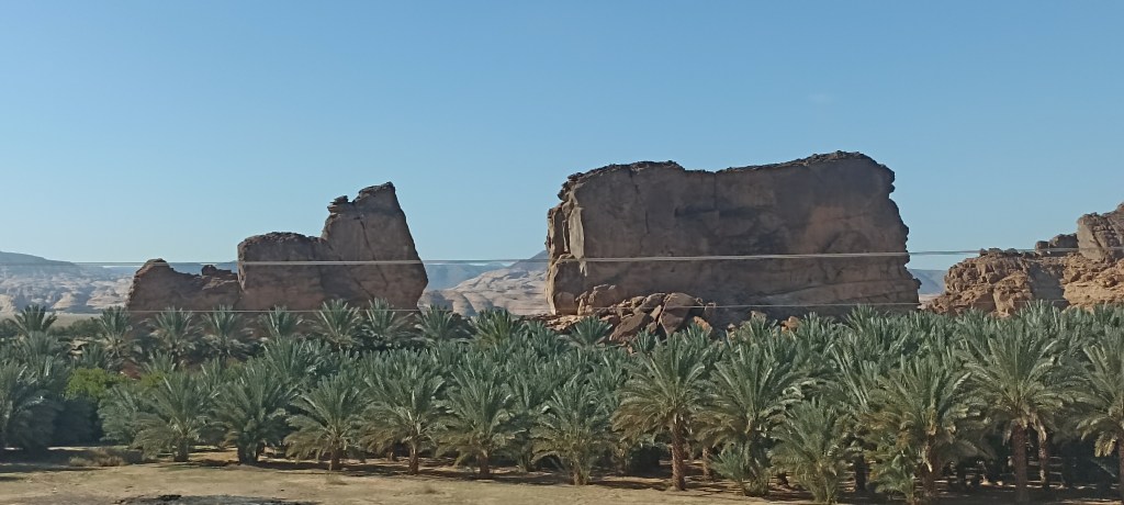 ٱلْعُلَا (AlUla) yra Medinos provincijoje esantis oazės miestas, Saudo Arabijos šiaurės vakaruose. Atsivėrus šaliai, šioje vietoje galima rasti daug įdomių dalykų. Vieni jų skirti prabangos mėgėjams, kiti – pažinimo mėgėjams. Kadangi pačioje AlUloje reikiamam periodui neradau laisvų viešbučių,o ir jiems esant laisviems, kainos gali netgi labai pasikandžioti, pasirinkau Tabuko miestą. Iš Rijado lėktuvas pakilo kiek vėluodamas, nes buvo tirštas rūkas, o leidžiantis Tabuko oro uoste oras buvo puikus. Nelabai didelis, tačiau šiuolaikiškai įrengtas oro uostas buvo apytuštis, tad pagriebęs lagaminą gana greitai atsidūriau lauke. Tabuke Uber programėlė neveikia ir šį kartą reikėjo pasinaudoti Careem paslaugomis. Pasisekė, kad automobilis atvyko greitai ir po keliolikos minučių jau buvau viešbutyje. Miestas yra atokaus šalies rajono, tačiau yra švarus, plačios gatvės. Viešbutis apskritai nustebino šiuolaikiškumu, o visas personalas puikiai kalba angliškai. Šiandien planavau tik padirbti ir pailsėti po visų prieš tai buvusių dienų, todėl tiesiog nuėjau iki netoliese esančio prekybos centro pavalgyti. Viešbutyje gavau laikiną kambarį kol sutvarkys mano, nes atvykau ryte ir kambarys buvo neparuoštas, todėl galėjau pailsėti. Kitą dieną laukė naujas nuotykis. Anksti ryte išvykau į AlUlą. Iš tiesų tai miestelio pavadinimas, kuriuo vadinama nemaža istorinio paveldo kaupina teritorija. Turėjau pasižymėjęs kelias vietas, kurias būtina aplankyti, bet juk ne pagal planą būna dažniausiai įdomiau. Pasirodo bilietus reikia užsisakyti iš anksčiau, o aš naiviai tikėjausi juos gauti vietoje, bet visuomet praverčia pažintys, kurios gelbėjo ir šiandien. Mane vežantis vairuotojas po keleto skambučių kur reikia, į telefoną gavo du bilietus – vienas veidrodinio pastato lankymui, o kitas poros valandų turui. Važiuojant kraštovaizdis pamažu pradėjo keistis ir rastis vis daugiau Jordaniją primenančių vaizdų. Ir iš tiesų Jordanijoje esančią Petrą primenančių vaizdų čia apstu. Visoje šioje didžiulėje teritorijoje daugiau nei prieš du tūkstančius metų viešpatavo nabatėjai. Jie buvo įsikūrę patogioje prekybos kelio vietoje, be to po savimi turėjo nemažai gruntinio vandens, kurį naudojo. Didelę kelio atkarpą šalimais buvo galima matyti buvusio piligrimų geležinkelio likučius. Šis maršrutas, vadinamas Hedžaz, daugiau nei prieš šimtą metų, jungė Damaską ir Mediną. Buvo matyti keletas buvusių stočių, kurios yra restauruojamos. Kiek vėliau vis daugiau matėsi sodų ir palmių giraičių. Vešli žaluma buvo priešprieša uolienai ir smėliui. Keitėsi ir uolienos spalva – buvusi rusvai pilkšva ar juoda keitėsi į rausvą, rudą ir geltoną. Mano pirmasis sustojimas buvo prie veidrodinio pastato, kuris vadinamas Maraja (arab. veidrodis arba atspindys). Tai į rekordų knygą įrašytas pastatas kaip didžiausias veidrodinis statinys. Jame yra koncertų salė ir restoranas. Įspūdingai atrodantis statinys yra viename iš slėnių. Buvo matyti tvarkoma automobilių aikštelė, taip pat valomi veidrožiai ir tvarkome aplinka. Po poros dienų čia atvyksta arabų pasaulio pop žvaigždė, o be to vakarais duris atveria prabangus restoranas ant stogo. Statinys atrodo tikrai įspūdingai, kai matosi ne tik smėlio, bet ir uolų bei dangaus atspindžiai. Bilietą turui po apylinkes turėjau antrai valandai popiet, todėl dar buvo laiko aplankyti keletą kitų vietų. Pirmiausia nuvažiavome iki dramblio kalno Jabal AlFil (žebel al fil). Pati dramblio teritorija buvo laikinai uždaryta, tačiau viskas puikiai matėsi kiek iš tolėliau ir galėjau laisvai fotografuoti neprieidamas artyn. AlUla senamiesčio didžioji dalis taip yra buvo uždaryta tyrinėjimams ir renovacijai. Jį ruošiamasi paversti dideliu muziejumi po atviru dangumi. Galiausiai atvykau į Winter Park teritoriją. Čia yra visų turų pradžia, kur sėdama į specialius autobusus ir važiuojama pasirinktu mašrutu. Šiandieninis mano turas – dviejų valandų Hedžra. Iš pradinės stotelės autobusas nuveža iki lankytojų centro, iš čia kitas autobusas važiuoja pirmojo lankytino objekto link. Autobusai kursuoja kas dvidežimt minučių, todėl išlipus iš vieno ir apžiūrėjus objektą bei išklausius gido pasakojimą, lipama į kitą atvažiavusį auobusą. Galima rinktis tą patį turą visureigiais ar arklių traukiamais vežimais. Pasirinkę šį turą išvysite nabatėjų kapavietes, kurios yra kaip Petroje, Jordanijoje. Šiuo metu yra šeši sustojimai, tačiau buvo matyti dar bent keletas papildomai įrengiamų. Visur yra švaru ir tvarkinga, į vidų užeiti neleidžiama, tačiau fotografuoti galima į valias. Šiame ture užtrukau kiek ilgiau nei dvi valandas, nes norėjosi apeiti kuo daugiau. Galiausiai grįžęs į pradinį tašką, sėdau į automobilį ir pajudėjau Tabuko link. Laukė beveik trijų valandų kelionė trumpesniais keliais.