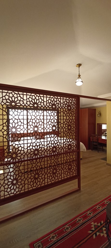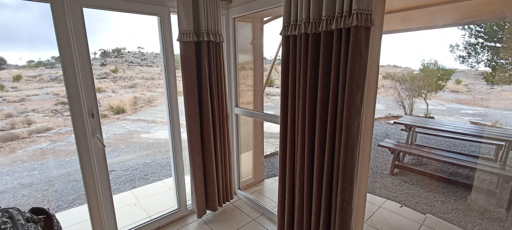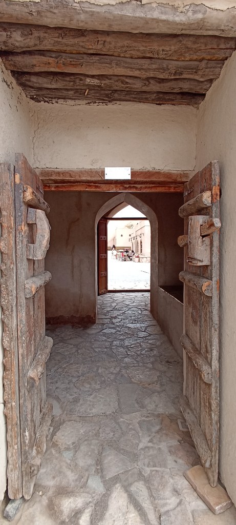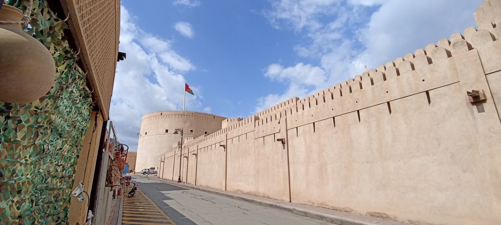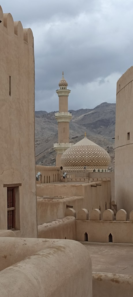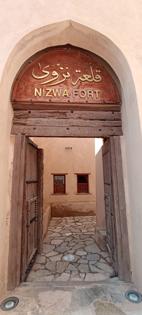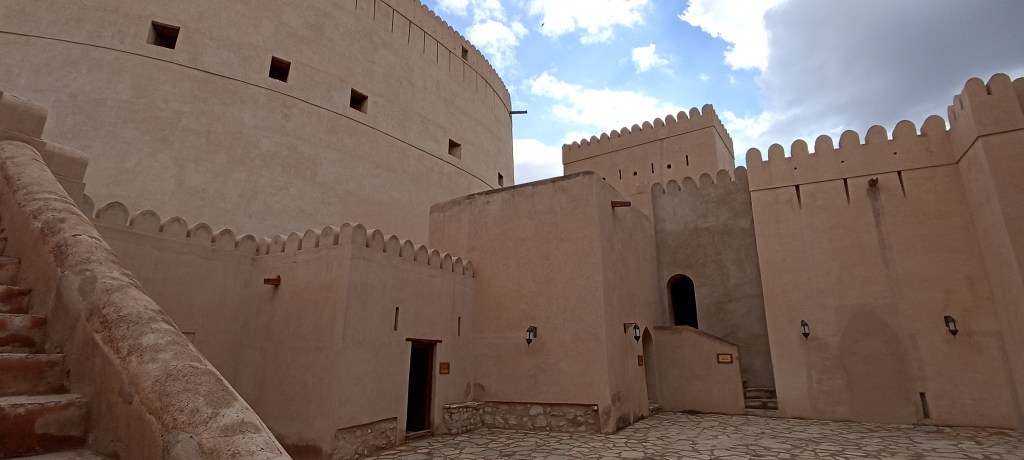 Iš Maskato pirmiausia nuvažiavau iki Nizwos miestelyje esančio forto (yra visoje šalyje veikianti aplikacija Otaxi, kuria ir pasinaudojau). Fortų Omane yra nemažai, vieni didesni, kiti mažesni, į kai kuriuos pakliūti neįmanoma, tačiau juos pamatyti tikrai verta. Verta ne tik dėl to, kad apžiūrėti juos iš vidaus, bet ir dėl nuo jų sienų atsiveriančios panoramos. Viename fortų jau buvau Maskato mieste, nuo kurio ir darytos senamiesčio panoraminės nuotraukos, o dabar atvykau į kitą. Šiandienos oro prognozė pranašavo šiek tiek lengvo lietaus ir buvo nupiešti tik du lašai, tačiau labai artima ateitis parodė, kad įsivėlė nedidelė klaida ir lietus neilgai trukus skalbė viską ir visur. Įėjimo į fortą bilietas kainavo 5 rialus, galima luktelti gido, kuris palydėtų arba eiti savarankiškai. Daugybė patalpų, svetainių, maldos kambarių, kalėjimas, yra keletas kambarių su eksponatais. Šiame forte galima vaikščioti beveik visais stogais ir pakilti į bokštą. Patarimas būtų žiūrėti po kojomis, nes turėklų nėra. Nukritusių ir besivoliojančių nesimatė, bet nusiversti nėra sudėtinga. Iš viršaus galima apžiūrėti Nizwa centrą, šalimais esančių namų stogus, pavėsines ir terasas, tolėliau matyti turgus (souq). Kai jau nusileidau žemyn ir sugalvojau, kad reikia atsigerti kavos, pasirodė pirmieji lietaus lašai. Aišku pirmoji mintis buvo, kad tuščia to lietaus, bet greitai teko brautis kavinės vidun, nes prasidėjo liūtis. Ir kas dabar bus, kai trūks plyš reikėjo nueiti į turgų ir po to nuvažiuoti iki viešbučio. Protarpiais, kai lietus aprimdavo, bandydavau iškišti nosį lauk, bet vėl tekdavo grįžti vidun. Matant, kad lietus nesibaigs, nusprendžiau bristi per balas ir pradėjusias gatvėje susidaryti upes, į turgų. Pasisekė dėl to, kad visi turistai buvo išsilakstę ir dirbo tik keletas parduotuvėlių. Viens du, rankose keli pirkiniai ir vėl pasinaudodamas aplikacija laukiu taksi, kuriuo nuvažiavau iki viešbučio. Buvo užsakytas kambarys viešbutyje, kuriame apsistosime ir su keliautojais. Čia pat vakarienė su pusryčiais. Ir kaip buvo gerai išnerti iš permirkusių rūbų. Viešbutyje yra kavos ir arbatos rinkinys, virdulys ir vandens nemokamai. Galima pasidaryti nescafe, ar lietuviškos užpiltinės. Buvo smagu vartaliotis šiltuose pataluose, bet gaila jog nepavyko dėl lietaus nuvykti iki Bahlos forto, kuris yra visai netoliese.