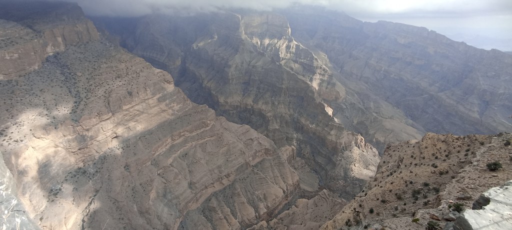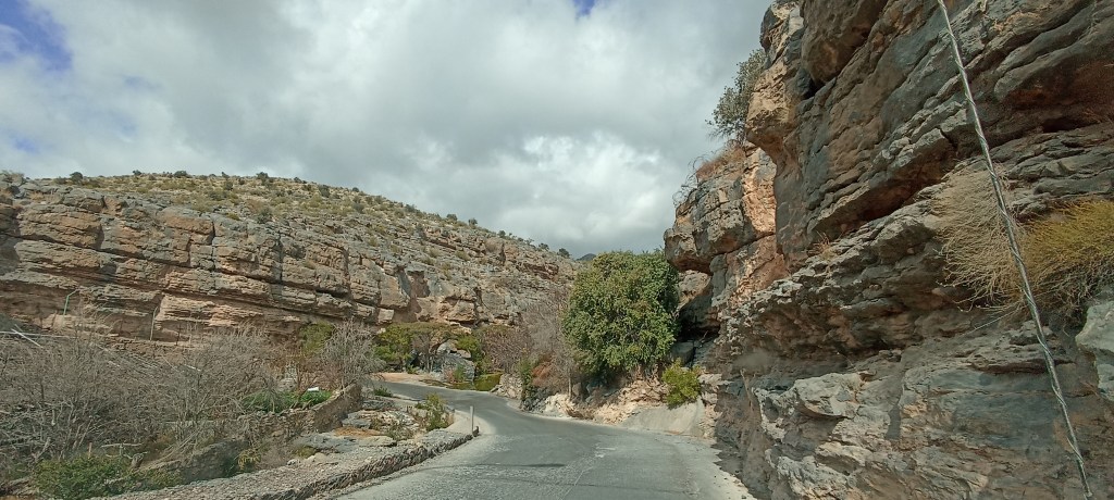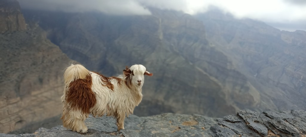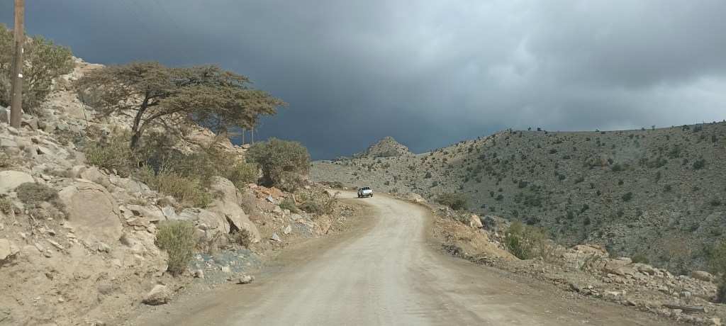 Kitą dieną, po pusryčių atvyko tą patį rytą užsakytas automobilis su vairuotoju ir už sutartą sumą turėjo nuvežti mane iki Jebel Akhdar (Žaliojo kalno), o vėliau iki Jebel Shams (Saulės kalno). Diena buvo apniukusi, tačiau nelijo, kol kas. Patraukėme į kalnus. Kiek pavažiavus Jebel Akhdar link yra patikros postas, pro kurį praleidžiami tik keturiu varomų ratų automobiliai, nes kelias yra labai status. Čia matyti ir daug paliktų nuomotų automobilių, kai atvykę toliau bando tranzuoti, kad pakilti į viršų. Ir iš tiesų kelias vingiuotas ir nuolatos kyla aukštyn. Pakilus kiek aukščiau, galima matyti nemažai viešbučių, kaimelių, karines bazes, slėnius, po lietaus atsirandančių upių akmenuotas vagas. Vairuotojas stodavo vietose, iš kur atsiveria nuostabūs vaizdai, o važiuojant didelę kelio dalį dengė toks rūkas, kad kartais buvo neįmanoma net kelio normaliai matyti. Ant šio kalno yra ir keletas trekingo maršrutų, taigi būna atvykstančių ant kalno, o po to keliaujančių šlaitais tolyn. Šiandien tokios minties aš neturėjau, kadangi reikėtų planuoti papildomas bent porą valandų, o pasigrožėjus debesyse ar rūke skendinčiais vaizdais, reikėjo leistis žemyn. Kelias yra labai vingiuotas ir status, tai leidžiantis žemyn galima matyti specialiai padarytas keletas kelio atšakas nelaimės atvejams, kai sudega stabdžiai – pabėgimo juostas. Tose vietose arba padaryti savotiški kalneliai prarasti greičiui, yra puri kelio danga ir galiausiai plastikinės statinės. Poroje matėsi jos buvo panaudotos. Nusileidę žemyn sukomės kito kalno link ir praėjus ne per daugiausiai laiko kelias vėl pradėjo kilti gana stačiu šlaitu aukštyn, be to buvo labai vingiuotas. Galima sakyti išvien serpentinai. Fotografuoti ir filmuoti buvo sudėtinga, nes tikrai nesinorėjo išpilt mašinos lango ar atbula ranka su telefonu šerti per veidą vairuotojui jį išjungiant. Jo dar reikia iki kalno viršūnės. Žiūrint kai kurią filmuotą medžiagą net akis suvesti būna sunku, nes ranka vis makalavosi. Geriausia stebėti tokius vaizdus yra gyvai. Paskutinieji apytiksliai aštuoni kilometrai yra žvyrkelio ir akmenų. Taigi čia taip pat reikėtų atvykti tam tinkamais automobiliais. Paskutinė stotelė – Didžiojo kanjono panorama. Šį kartą vaizdas buvo debesuotas, tačiau matėsi milžiniškas kanjonas ir skardžiai. Palei kraštus reikėtų eiti labai atsargiai, nors žiūrint į ožkas, atrodytų vieni niekai. Viena jų labai mielai pozavo, kol nusitaikiau ir padariau keletą kadrų. Kita, tuo metu, puotavo plastikiniame maišelyje, nes jame buvo kažkieno pikniko likučiai. Tokių pozuotojų yra ir daugiau, o važiuojant pakeliui kai kurios jų ramstė pakelės medžius, bandydamos prisitraukti prie medžių žaliosios dalies. Nelaipiojo jos čia medžiais kaip kad marokietės, bet matėsi, kad aukščiau esantys lapai jas viliojo labiau nei apatiniai. Vaizdas į kanjoną ir panoraminė aikštelė buvo paskutinis planuotas taškas šiandiena ir kelias valandas tryvojęs lietus neišlaikė, ir pradėjo lyti, todėl pats laikas buvo važiuoti į ant šio kalno esantį viešbutį. Iš visų kambarių atsiveria vaizdai į kalnus, kurių niekas neužstoja. Namukuose yra visi patogumai, švarūs patalai, o viešbutis siūlo vakarienę ir pusryčius. Pradžioje dar planavau pasivaikščioti aplinkui, bet įsismarkavęs lietus pakeitė planus ir teko būti kambaryje. Geru oru yra kur pasėdėti lauke prie kiekvieno namuko arba pavėsinėse. Yra taip pat kavinė su keliais kleckais, kava ir arbata, yra įrengtos ugniavietės. Labiausiai džiuginęs dalykas čia buvo tyla.