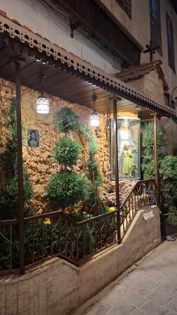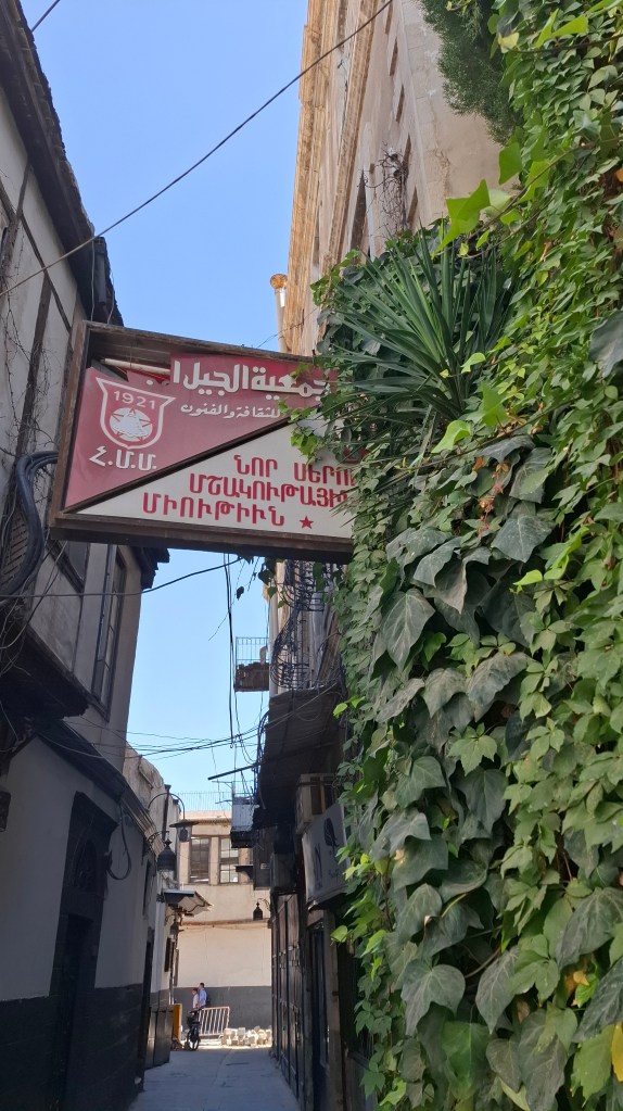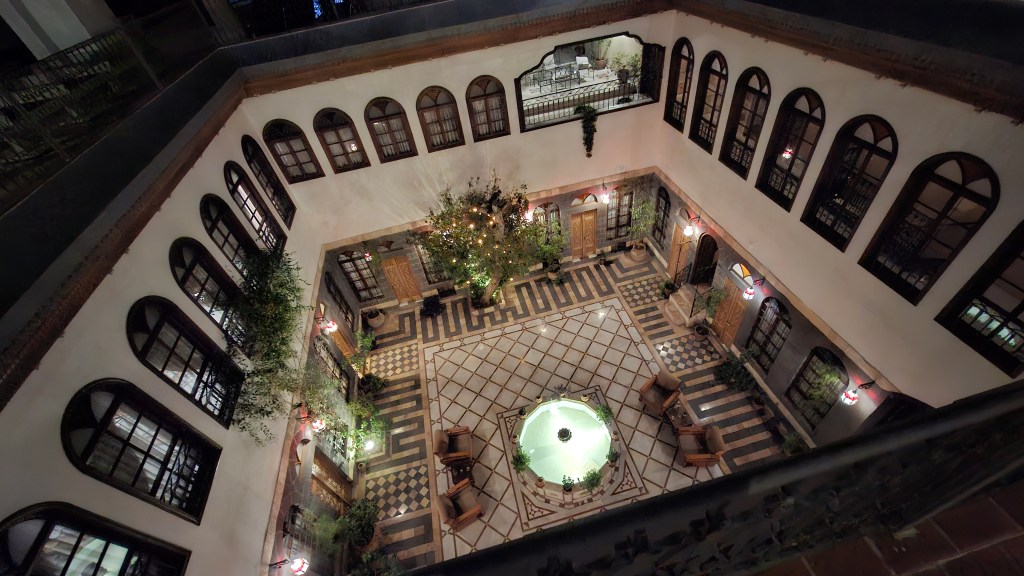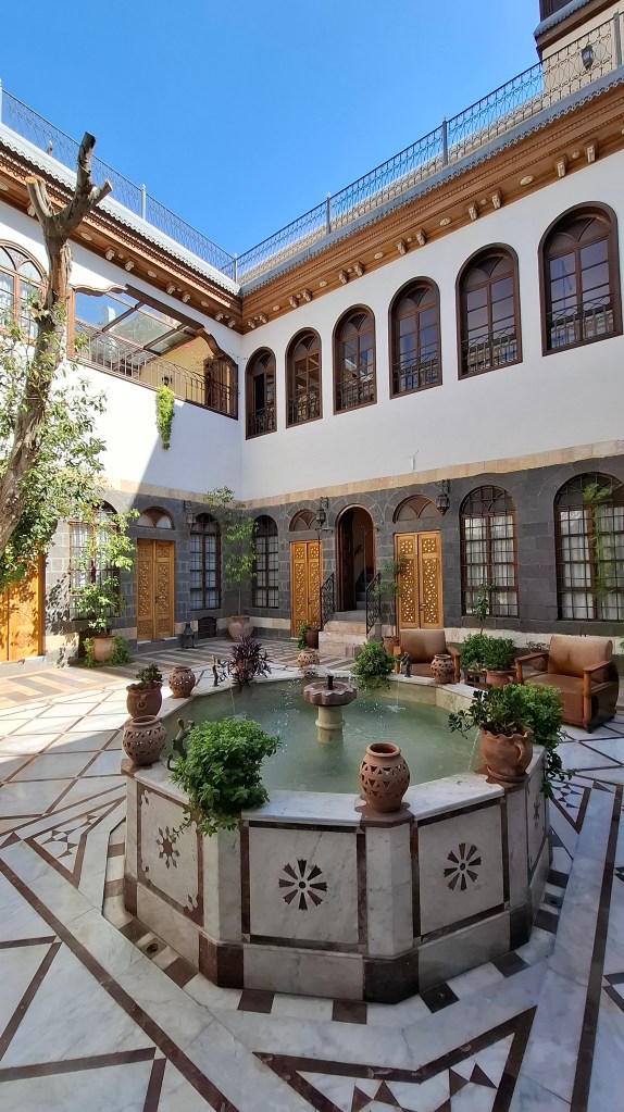Kitas rytas prasidėjo puikiais pusryčiais ir galiausiai atvyko automobilis, vežantis iki pat Damasko. Viskas buvo suorganizuota iš anksto, tad pirmiausia leidomės pasienio su Sirija link, kilome į kalnus ir galiausiai atvykome. Čia buvo matyti nemažai visureigių, kurių keleivisi buvo apsirengę rimtai ir jų pasai buvo diplomatiniai. Jau galvojome užtruksime ilgai, kol bus atliktos visos žinomos ir nežinomos procedūros, bet viskas užtruko gal apie dvidešimt minučių – iš tiesų patikrinti dokumentai ir įdėti išvykimo antspaudai. Susitvarkę Libano pusėje, nuvažiavome iki Sirijos pusės. Čia jau buvo daugiau veiksmo, nes tvarkomi ne tik lengvaisiais automobiliais keliaujančių dokumentai, bet ir įvairių važiuojančių krovinių. Apie pusvalandis vargelio ir jau važiavome Sirijos teritorija. Čia jau visai netoli ir Damaskas. Naujos statybos sumišę su apgriautais, sprogdintais, apšaudytais ar degintais namais. Atvažiavus iki senojo Damasko vartų, toliau reikėjo eiti pėstute, nes senamiestyje buvo dedamas akmeninis grindinys, todėl ratais kvadratais ir dar nešant lagaminą, pasiekėme viešbutį. Jau artėjant prie viešbučio matėsi daug sutvarkytų namų, gražiai įrengtų parduotuvėlių, kavinių, užkandinių. Siaurose gatvelėse buvo Marijos statulėlių, keletas bažnyčių ir galiausiai priėjome vieno iš akmeninių pastatų duris. Kai pabeldus jas atvėrė viešbučio darbuotojas, tai pakliuvome tarsi į visai kitą pasaulį. Čia buvo ramus vidinis kiemas su fontanu viduryje, nišose minkštasuoliai, keletas nedidelių medžių ir visiškai nesigirdėjo miesto bruzdesio. Šiame viešbutyje yra tik dvylika kambarių, visi yra skirtingi ir pastatas buvo restauruojamas kelerius metus, atkuriamos autentiškos interjero detalės.